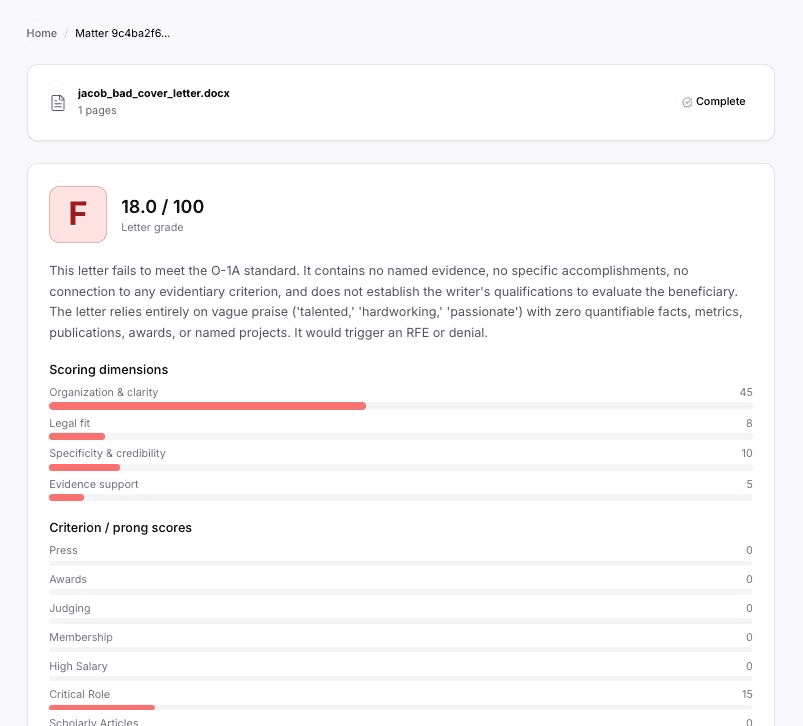 For O-1A petitions, each of the eight evidentiary criteria (Awards, Membership, Press, Judging, Original Contributions, Scholarly Articles, Critical Role, High Salary) is scored independently, so you know exactly which prongs need strengthening.